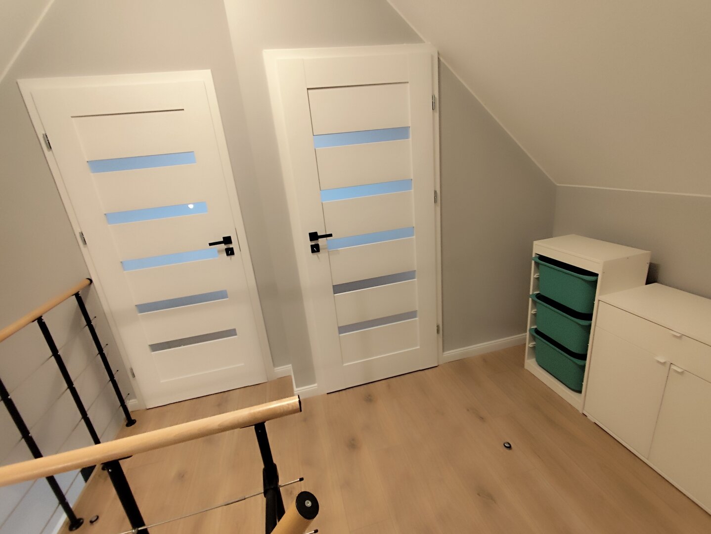 Domek ma w pełni wyposażoną kuchnię wraz z kuchenką mikrofalową, tosterem, niezbędbne garnki oraz grill i meble tarasowe. W salonie znajduje się rozkładana dwusosobowa kanapa oraz telewizor z dostępnem do aplikacji mobilnych. Obok do dyspozycji gości jest łazienka z toaletą i kabiną prysznicową. Na górze są dwie sypialnie, w jednej mamy rozkładane łóżko dwuosobowe, w drugiej łózko małżeńskie oraz niezbędne szafy. Dla każdego gościa zapewniamy komplet pościeli oraz ręczników. Jako gość domku VIP otrzymasz również skrzynię drewna do rozkoszowania się popłudniami w jacuzzi lub saunie.