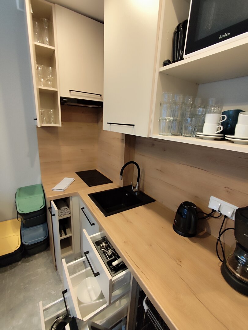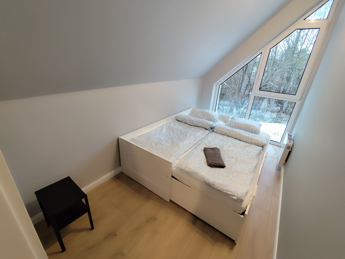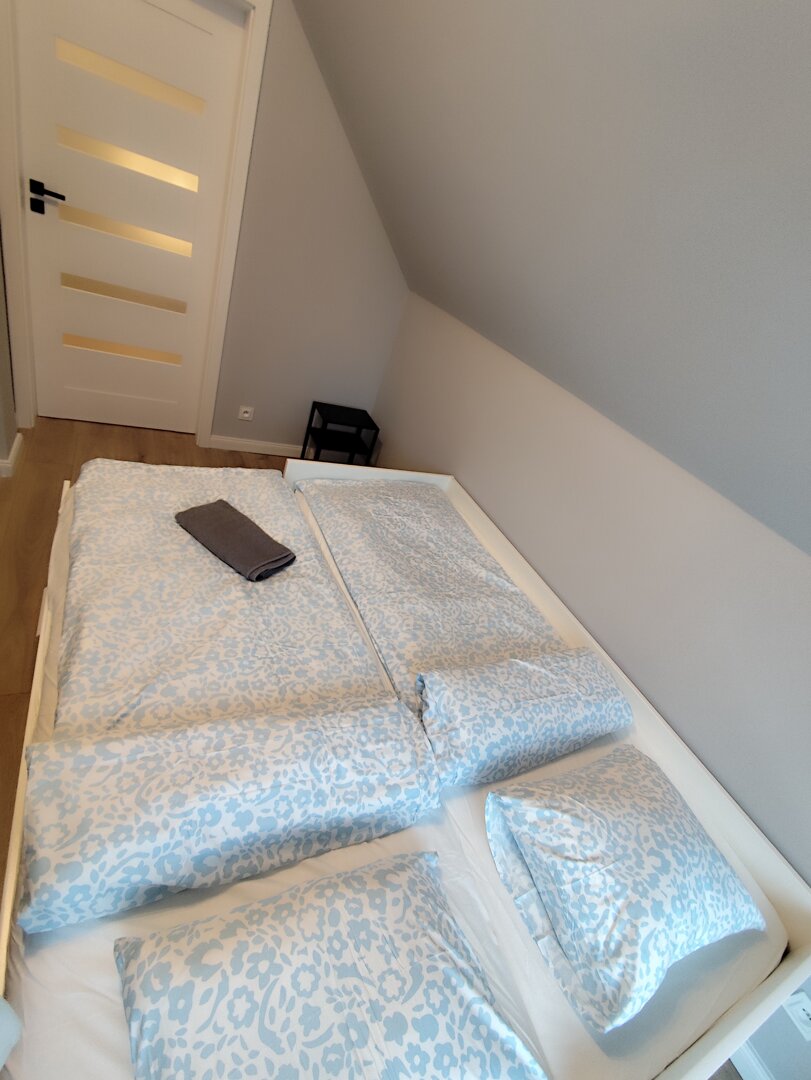 Domek ma w pełni wyposażoną kuchnię wraz z kuchenką mikrofalową, tosterem, niezbędbne garnki oraz grill i meble tarasowe. W salonie znajduje się rozkładana dwusosobowa kanapa oraz telewizor z dostępnem do aplikacji mobilnych. Obok do dyspozycji gości jest łazienka z toaletą i kabiną prysznicową. Na górze są dwie sypialnie, w jednej mamy rozkładane łóżko dwuosobowe, w drugiej łózko małżeńskie oraz niezbędne szafy. Dla każdego gościa zapewniamy komplet pościeli oraz ręczników. Jako gość domku VIP otrzymasz również skrzynię drewna do rozkoszowania się popłudniami w jacuzzi lub saunie.